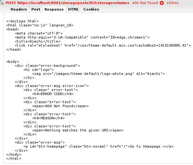 I am getting the following error while trying to upload a file into a storage pool: After some investigation I realized it is because you set the contentType as false (ie, '*/*') so Kimchi server will try to return a HTML according to the resource. In this case a Task resource. So it looks for a file: /home/alinefm/kimchi/ui/pages/Task.tmpl which does not exist and then the 404 error is reported. Check src/kimchi/template.py def can_accept_html(): return can_accept('text/html') or \ can_accept('application/xaml+xml') or \ can_accept('*/*') To solve this issue, we can change AsyncCollection (src/kimchi/control/base.py) to always return a JSON (see patch below) diff --git a/src/kimchi/control/base.py b/src/kimchi/control/base.py index 6391a1a..9ab6696 100644 --- a/src/kimchi/control/base.py +++ b/src/kimchi/control/base.py @@ -344,7 +344,10 @@ class AsyncCollection(Collection): args = self.model_args + [params] task = create(*args) cherrypy.response.status = 202 - return kimchi.template.render("Task", task) + cherrypy.response.headers['Content-Type'] = \ + 'application/json;charset=utf-8' + return json.dumps(task, indent=2, separators=(',', ':')) After applying this patch I was able to upload a file into a storage pool, but the dialog is not closed. I need to manually close the dialog and check the storage volumes inside the pool. (And any more errors on firebug =]) Let me know if you have any other idea to solve this content type issue. Otherwise, I will send the above patch for review.