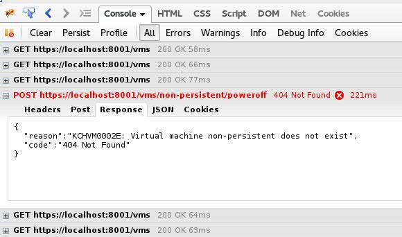 2) Access Kimchi interface and the new vm is displayed 3) Try to power it off. The dialog confirmation is displayed and when I confirm the action an error is shown on top of page "The VM for-test does not exist" 4) Then some a few seconds the VM is removed from Guests tab.